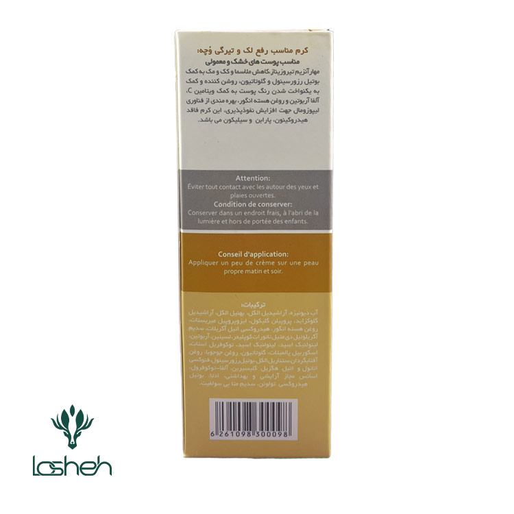 کرم رفع لک و تیرگی مناسب پوست خشک و معمولی وچه محصولی جهت کاهش کک و مک و همچنین لک و تیرگی است. ترکیبات موجود در این کرم به کمک ویتامین C پوست را روشن میکنند و موجب یکنواختشدن رنگ پوست میشوند.